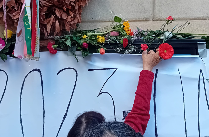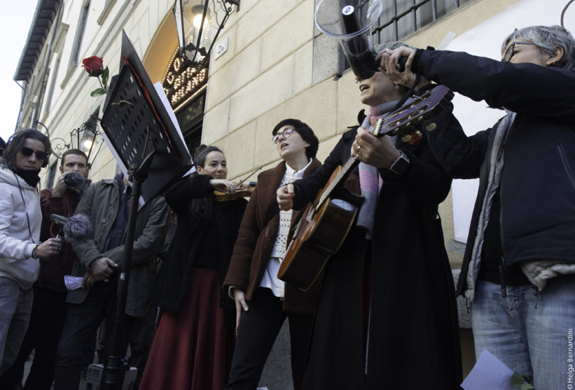 Avrebbe dovuto essere un flash mob, ma non è stato per nulla “flash”; per quasi due ore centinaia di persone hanno cercato di avvicinarsi al portone per firmare, lasciare un fiore, cantare insieme a chi cercava, con pochi mezzi, di farsi sentire.