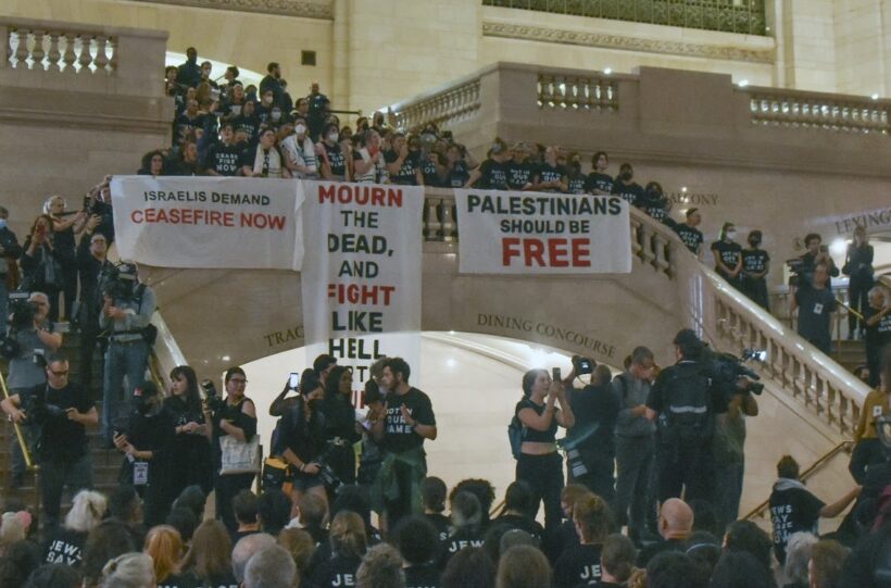 Il 27 ottobre parecchie centinaia di persone che indossavano la maglietta con la scritta “Not in my Name”, “Non in mio nome (la guerra)”, hanno occupato l’atrio della Central Station di New York. La manifestazione si è conclusa con l’arresto di 400 persone, tra cui rabbini, attori e deputati dello Stato di New York, del Senato e del Consiglio Comunale. Se particolarmente attiva per la pace in Palestina è la comunità ebraica progressista della città (Jewish Voice for Peace era la principale organizzatrice dell’iniziativa) erano presenti donne e uomini di varie nazionalità che hanno messo in campo quella che è stata definita la più grande protesta che New York ha visto in oltre due decenni.