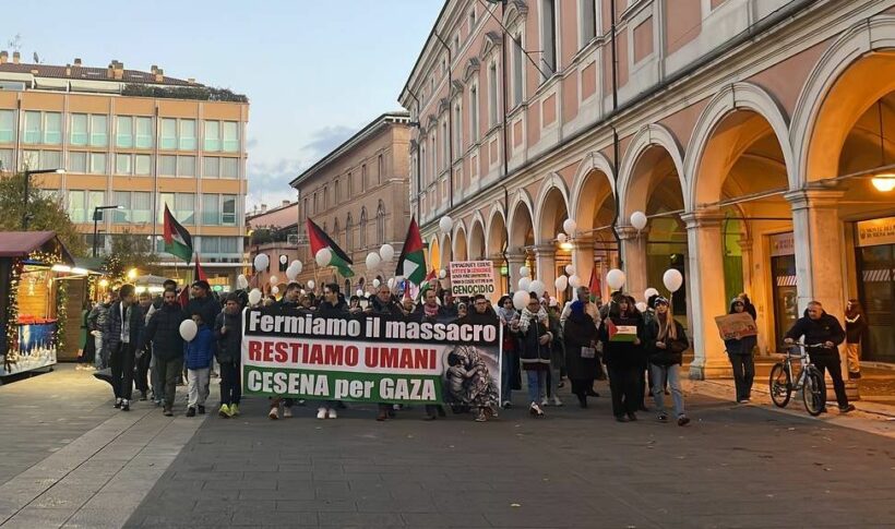 Si è conclusa con successo la manifestazione per la Pace e la fine del genocidio a Gaza tenutasi a Cesena nel pomeriggio di sabato 2 dicembre. Un pacifico e variopinto corteo dai Giardini pubblici ha attraversato in silenzio le vie del centro città per arrivare poi in Piazza del Popolo. La manifestazione vera e propria, che ha avuto luogo proprio sotto il loggiato del Comune, è iniziata con un flashmob dove i partecipanti si sono stesi a terra coperti da lenzuoli e palloncini bianchi a simboleggiare le migliaia di innocenti assassinati dai raid aerei che bombardano ininterrottamente Gaza da più di 50 giorni.