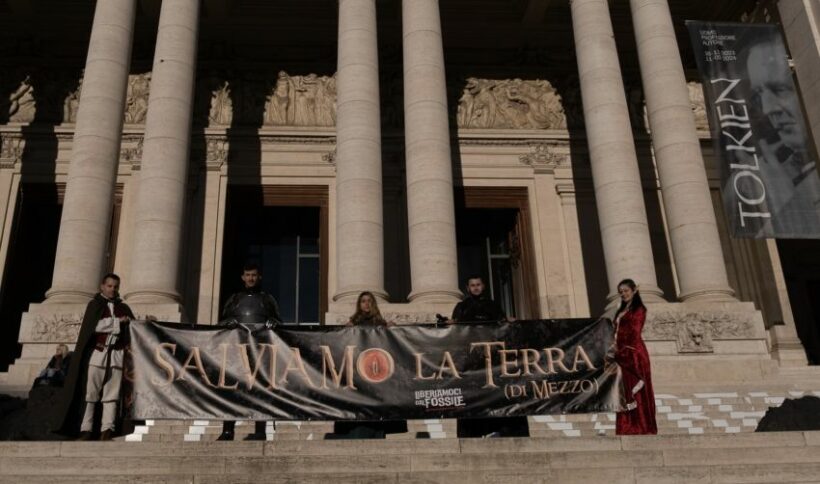 È andata in scena a Roma, nel pomeriggio di sabato 9 dicembre, fuori la Galleria Nazionale d’Arte Moderna e Contemporanea, un’azione di protesta creativa a tema Signore degli Anelli, per chiedere giustizia climatica ai leader internazionali riuniti alla COP28 di Dubai.