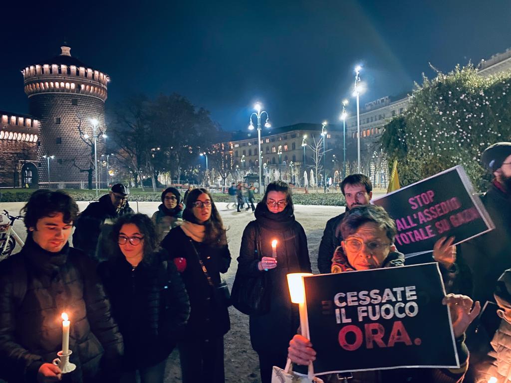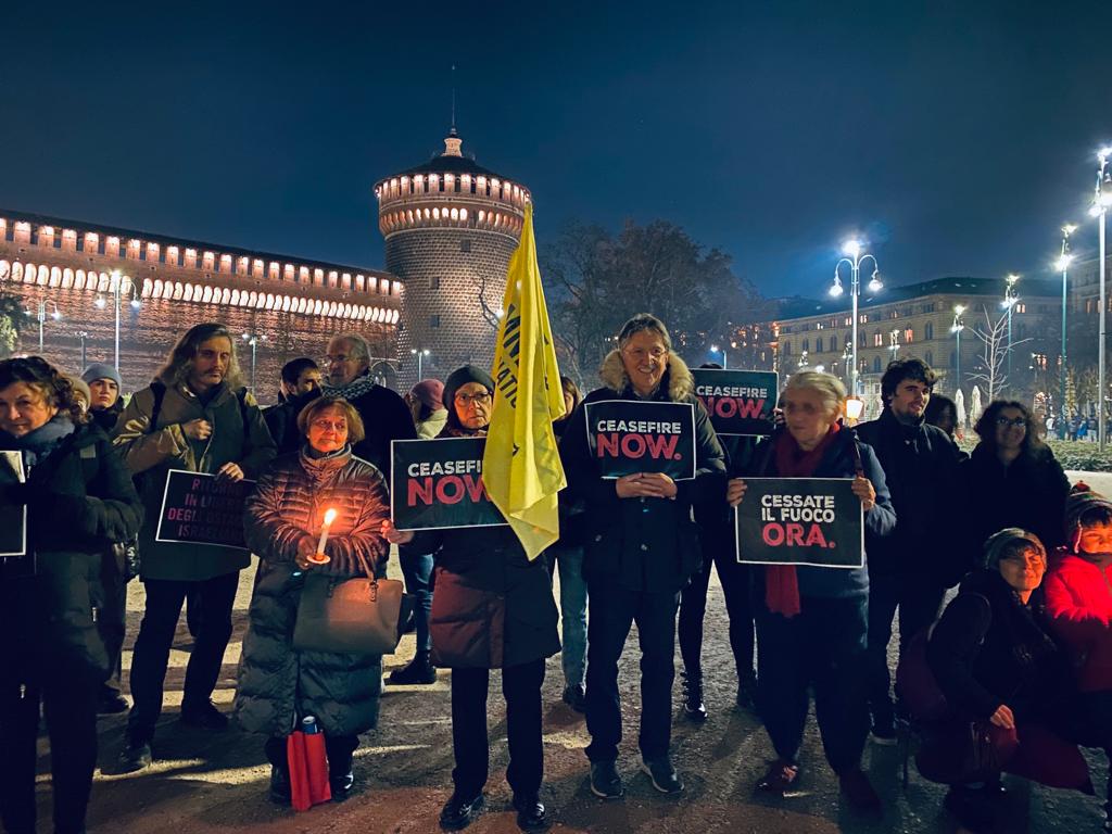 Il freddo non ha trattenuto cittadini e cittadine che, davanti al Castello Sforzesco, si sono uniti in una voce corale con cartelli e tante candele per chiedere l’immediato “Cessate il fuoco” e porre fine alla tragedia umanitaria a cui stiamo assistendo da più di sessanta giorni.