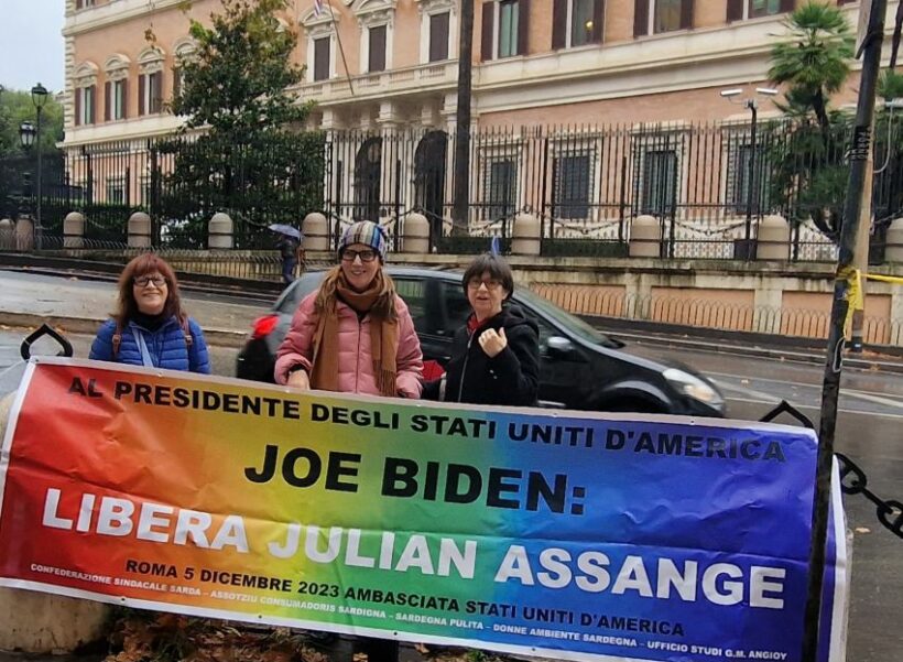 Malgrado le previsioni (poi verificatesi) di un’intensa pioggia a Roma, una decina di attivisti sardi hanno preso un aereo per la Capitale martedì scorso (5/12/2023) per consegnare a mano, presso l’Ambasciata degli Stati Uniti, una lettera rivolta al Presidente Joe Biden chiedendogli di porre fine alla persecuzione giudiziaria del cofondatore di Wikileaks, Julian Assange.
