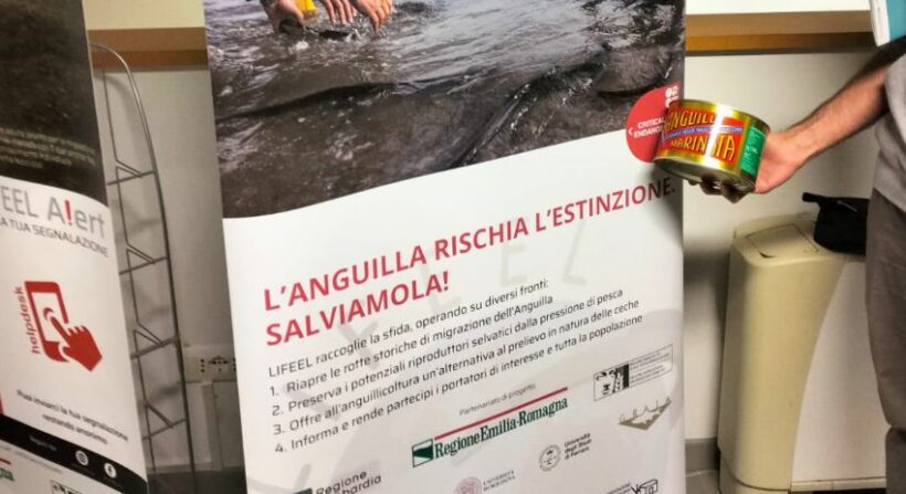 In quell’occasione mi sono soffermato ad osservare un manifesto dal titolo “L’anguilla rischia l’estinzione. Salviamola!”. Il manifesto è relativo a un progetto finanziato dal Programma LIFE della Comunità Europea, per la conservazione dell’anguilla (nello specifico Anguilla anguilla). Mi ricordo che in particolare fui colpito da dei contenitori in latta di anguilla marinata in vendita nella stessa sede che avevano un che di Sense no sense in relazione al suddetto manifesto. Erano forse il presagio di qualcosa di nefasto?