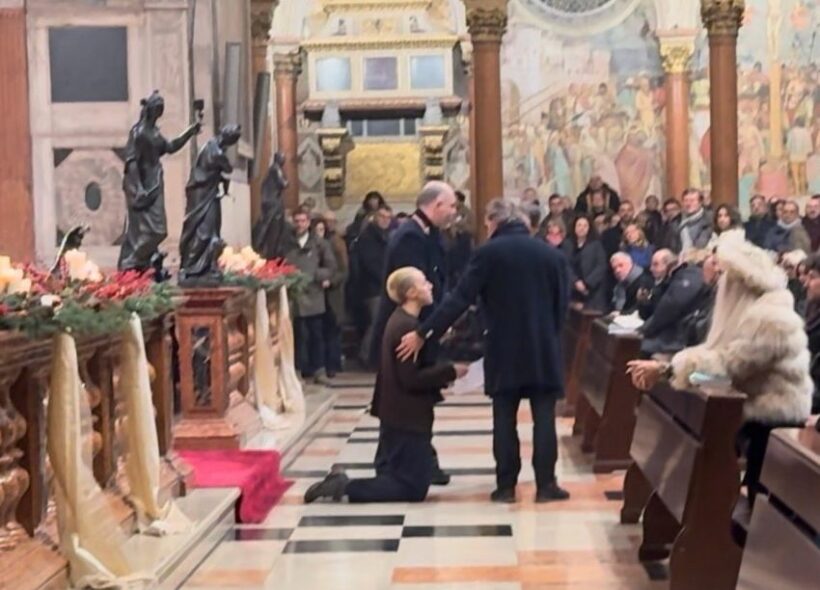 A Padova, alla Basilica di Sant’Antonio a mezzanotte due cittadini aderenti alla campagna FONDO RIPARAZIONE, promossa da Ultima Generazione, hanno preso la parola alla fine della messa esponendo dei cartelli con scritto “Gesù nasce, il pianeta muore” e “Meno soldi alle armi, più soldi alla gente”. Federica, inginocchiata all’altare rivolta ai fedeli, ha iniziato a parlare, ma dopo poche decine di secondi è stata accompagnata fuori dal servizio di sicurezza della chiesa che l’ha consegnata ad una pattuglia di polizia. Insieme a Tommaso, sono stati portati in questura e trattenuti fino alle 3 di mattina. Sono stati denunciati per manifestazione non autorizzata e turbamento di funzione religiosa. Questo è l’ennesimo esempio di una reazione totalmente sproporzionata contro cittadini che pacificamente esercitano il diritto di manifestare. È giusto che una minorenne venga denunciata la sera di Natale per avere provato, in modalità più assertiva, il messaggio di Papa Francesco?