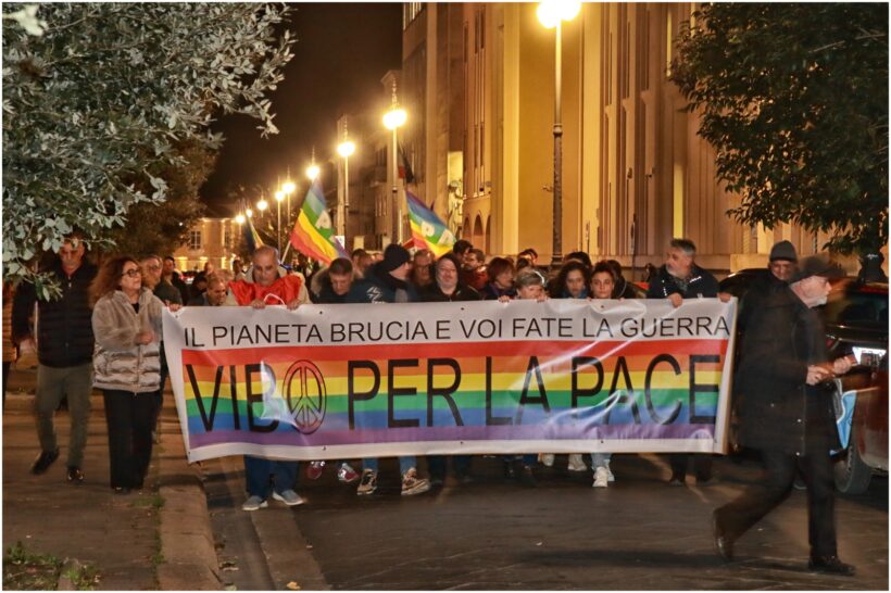 Un marcia silenziosa e senza bandiere se non quelle della pace e un lungo striscione con la scritta “IL PIANETA BRUCIA E VOI FATE LA GUERRA“. Sì, un pianeta che da anni brucia a causa dell’insipienza della specie umana che con l’inquinamento sta creando problemi a se stessa, oltre che all’ecosistema e che da sempre butta benzina sul fuoco autodistruggendosi con l’uso di strumenti di guerra. Si tratta di guerre lontane, ma non troppo; vicine perché spesso siamo noi occidentali, noi europei a incentivarle anche e soprattutto con l’invio di armi e di denaro per finanziarle. Ecco, quindi, il desiderio delle associazioni di dire la loro, di convincere i governanti a impegnarsi con tutte le loro forze, a spendersi indefessamente per la pace che non è assenza di conflitti, ma diligente zelo per un mondo migliore, più giusto e più equo.