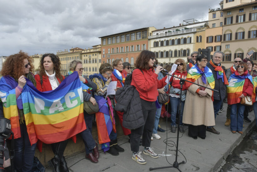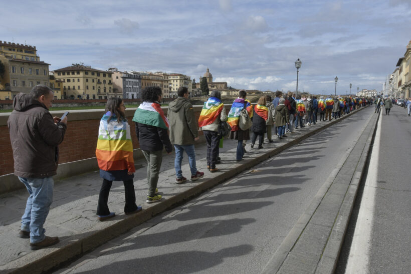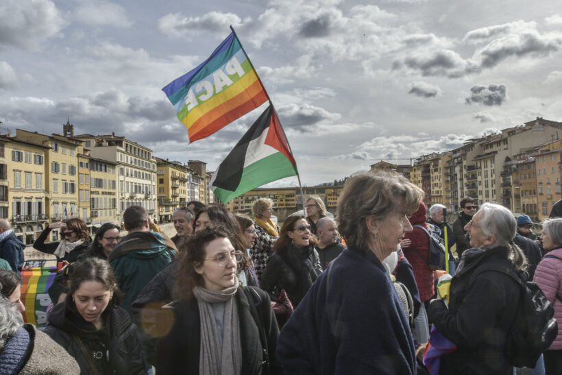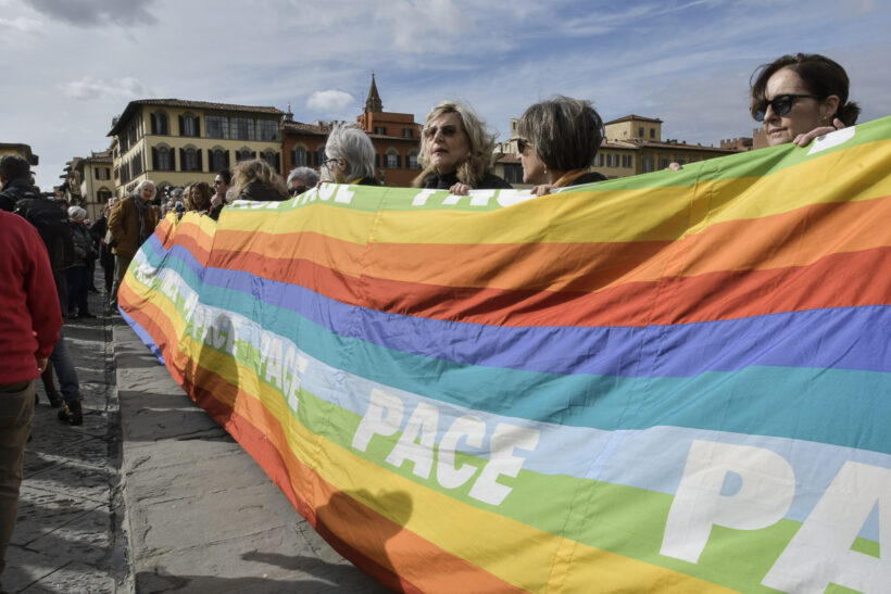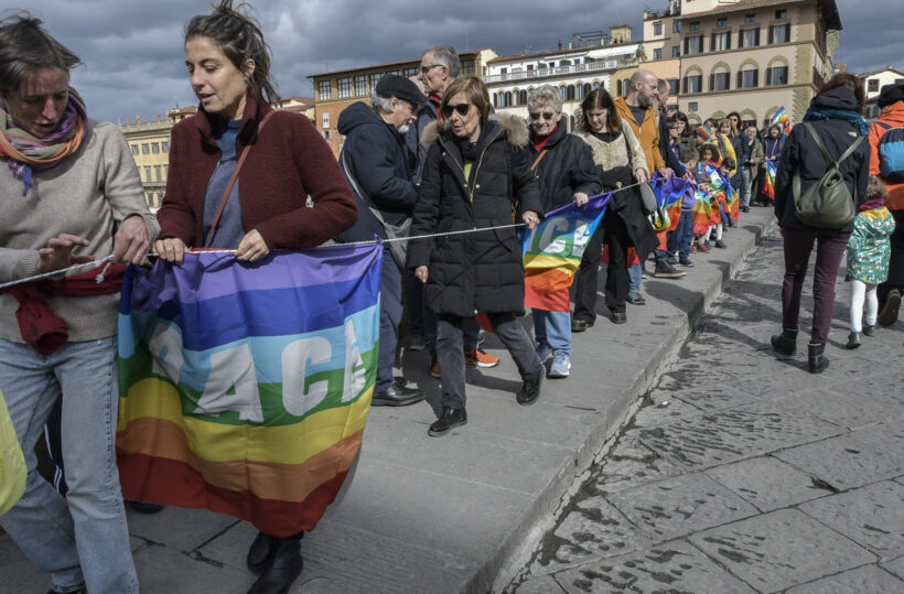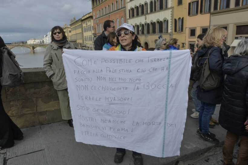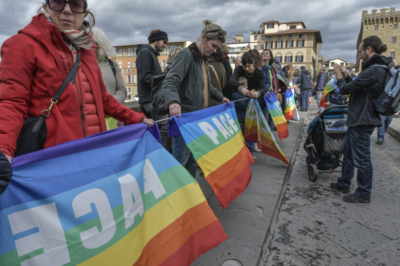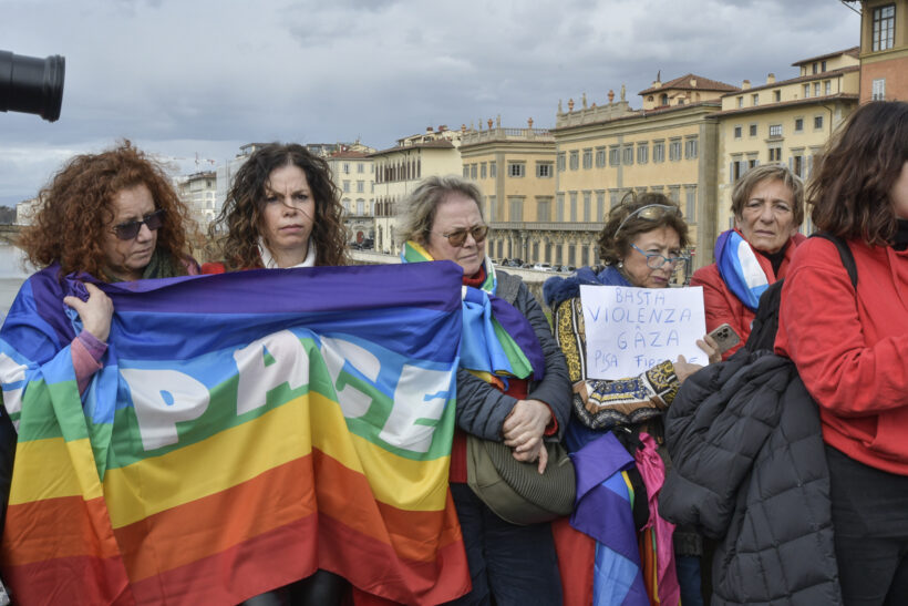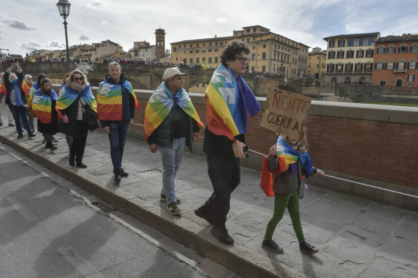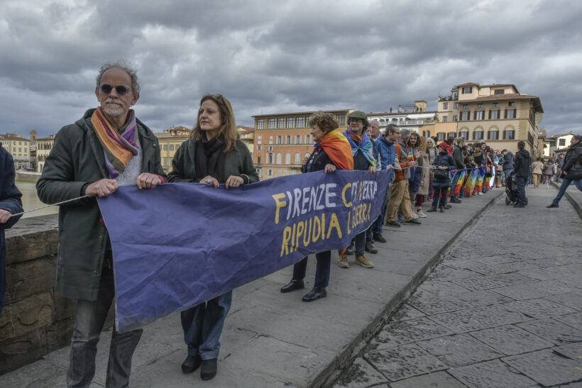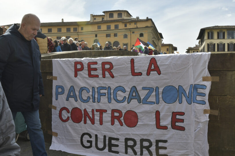 Nella ricorrenza della data di inizio della guerra in Ucraina il variegato mondo pacifista fiorentino  si è dato appuntamento stamani sul ponte a Santa Trinita, dove ebbe inizio la prima manifestazione no war ormai due anni fa.  Con la Cgil e l’Anpi, l’associazionismo militante pacifista e moltissimi cittadini  hanno costituito una catena umana che ha abbracciato le due sponde del fiume per incontrarsi sul ponte alla Carraia immediatamente a valle.