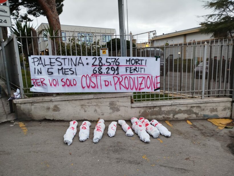L’iniziativa si è conclusa con un microfono aperto davanti ai cancelli della Leonardo spa, dove sono stati posati dei fantocci che richiamavano le migliaia di bambini morti sotto le bombe israeliane a Gaza.