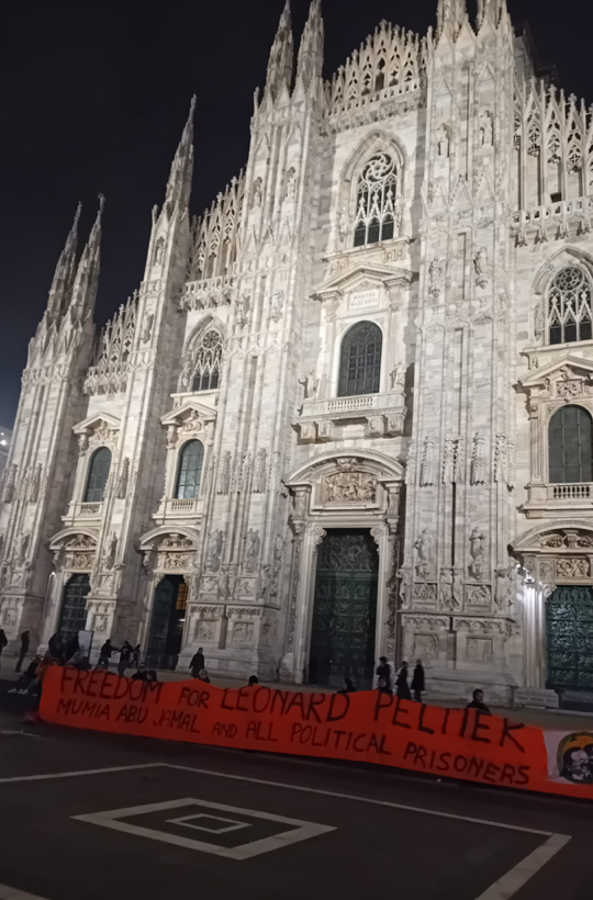 Ieri, 6 febbraio, era l’anniversario di quel maledetto giorno in cui il nativo americano Leonard Peltier venne arrestato in Canada, ingiustamente accusato di aver ucciso due agenti dell’FBI durante uno scontro a fuoco – e di nuovo anche quest’anno il comitato milanese Free Leonard Peltier ha inscenato nella centralissima Piazza Duomo di Milano il suo collaudato flash mob: lunghissimo striscione arancione trattenuto da una ventina di attivisti dinnanzi ai passanti che si fermavano incuriositi, mentre l’infaticabile Andrea De Lotto (principale ‘anima’ di questa campagna nel nord d’Italia, come ben sanno i lettori di Pressenza) rievocava al megafono i particolari della vicenda e le circostanze del suo arresto appunto il 6 febbraio di 48 anni fa – davvero troppi per un’accusa che persino gli accusatori di Peltier definirono poi ‘gravemente viziata’ per cui ‘infondata’.
