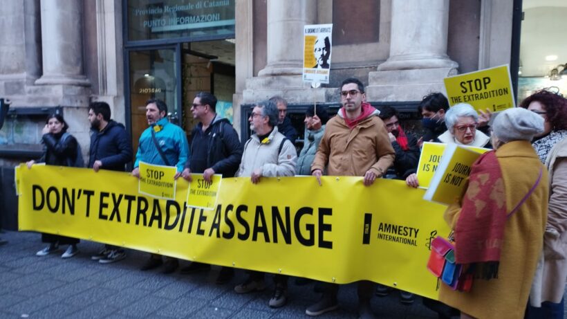 Non siamo a Londra, dove si è riunita una marea di sostenitori e sostenitrici di Assange. Siamo a Catania, in pochi per questa città ma, dicono, è già un successo questo manipolo di resistenti incuranti del freddo, radunato davanti la Prefettura. Non solo catanesi, c’è il gruppo arrivato da Palermo e quello di Ragusa. Certo, potremmo essere di più. Mancano in tanti, mancano i giovani, manca la stampa dei professionisti dell’informazione. I colleghi e le colleghe di Assange. Prima, mi raccontano, mentre il mio pullman affrontava il traffico dell’ingresso in città, un corteo composto, quasi una passeggiata di amici e amiche, compagni e compagne affettuose, è partito da Villa Bellini al ritmo dei tamburi della Scuola di Musica Popolare Sambazita tra gli slogan scanditi a voce alta.