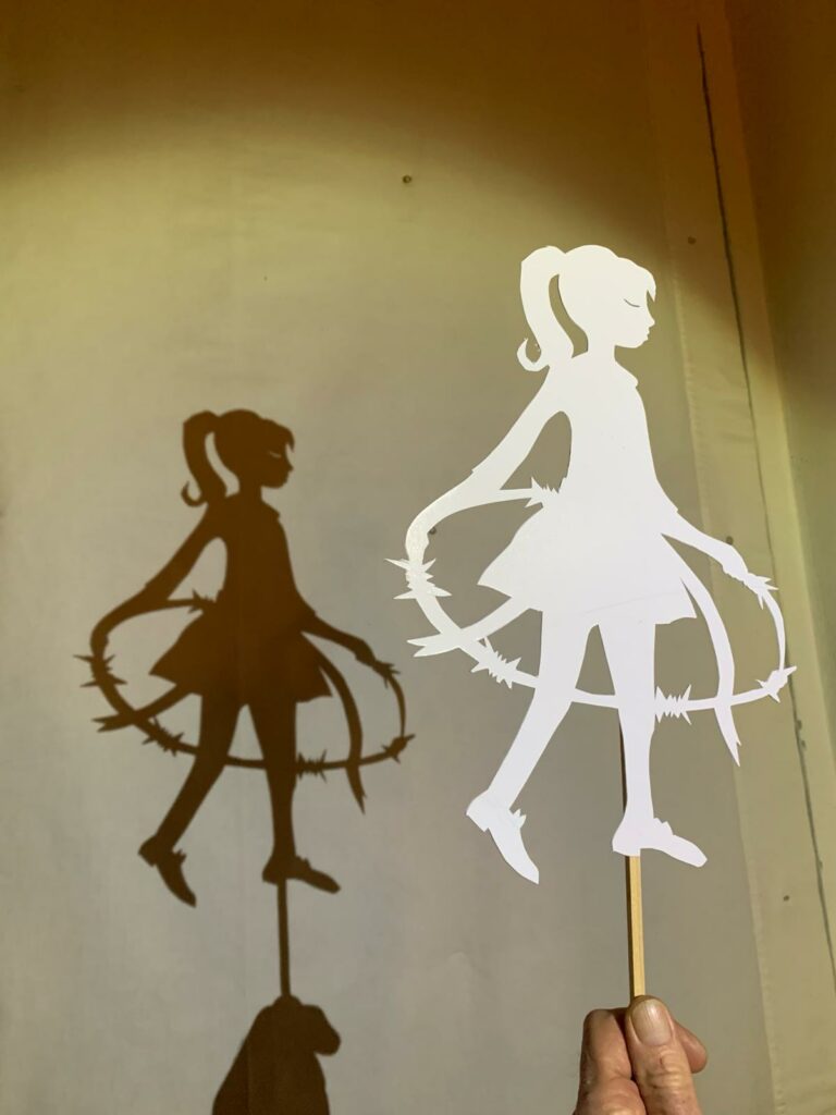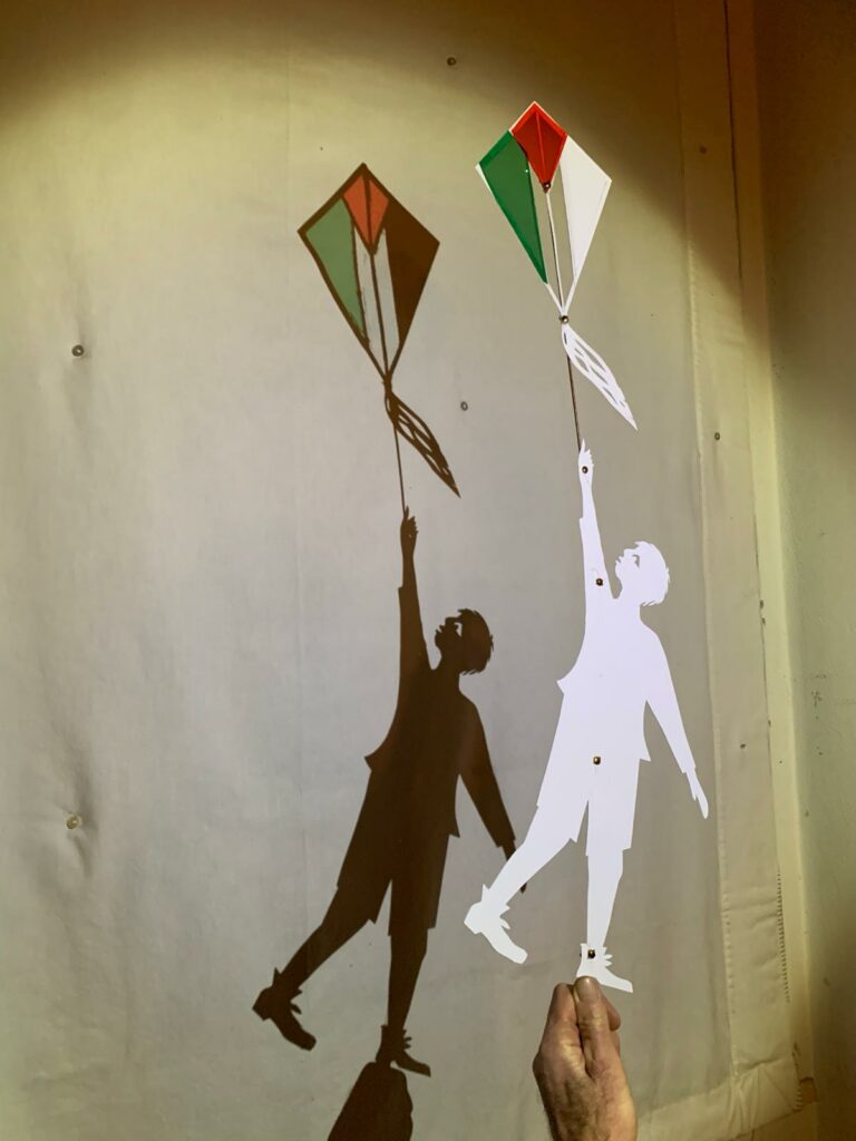 Dietro al telo semitrasparente , sagome di cartone, illuminate da piccole torce , si animano in una danza allegra e triste allo stesso tempo. Una bambina volteggia con un Hula-hop di spine , un bimbo fa volare un aquilone che, anche se bianco e nero, vediamo colorato .