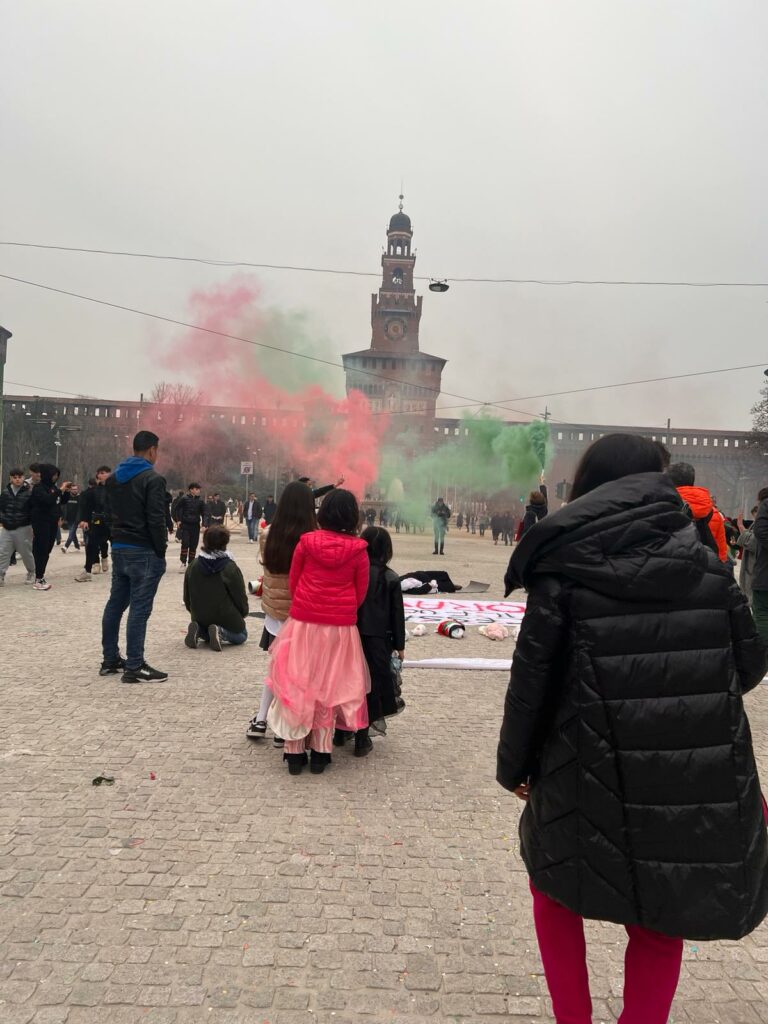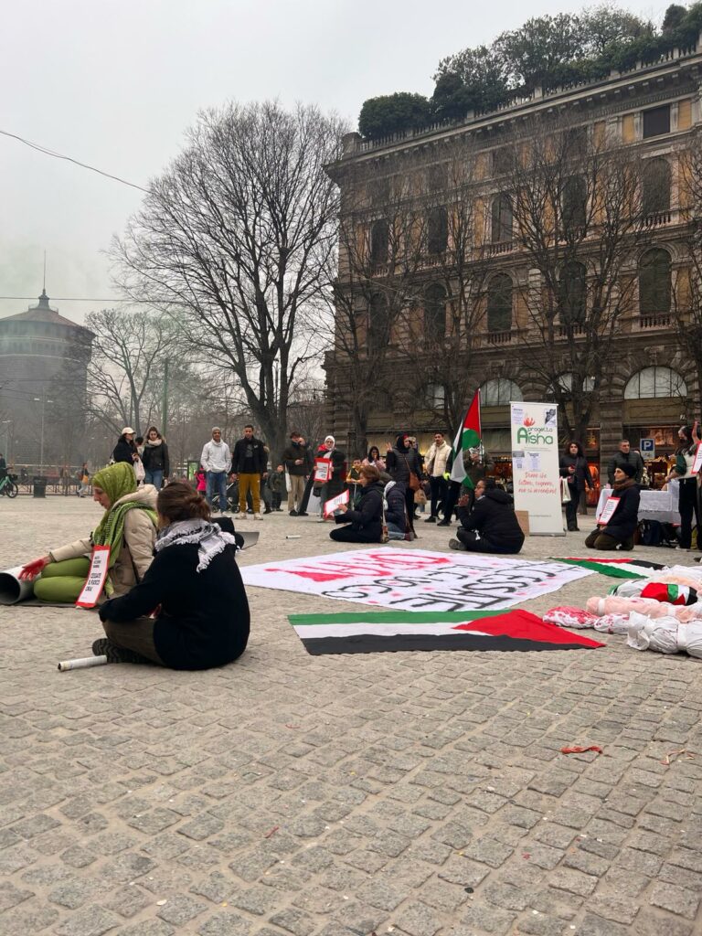 Amina è l’unica sdraiata per terra, col suo pacione ed un fagottino accanto a se. Rappresenta tutte le mamme di Gaza. Lei che è italo palestinese, la tragedia la vive in prima persona . Chissà a cosa starà pensando, per terra , al freddo.
