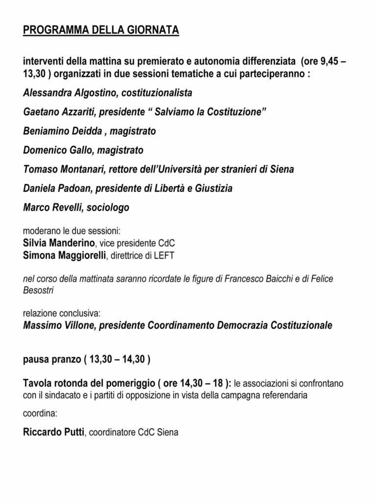 Nella mattina (ore 9,30-13,30) sono previste le relazioni di costituzionalisti, magistrati, giuristi e sociologi: Alessandra Algostino, Gaetano Azzariti, Beniamino Deidda, Domenico Gallo, Tomaso Montanari, Daniela Padoan, Marco Revelli e Massimo Villone, coordinati da Silvia Manderino, vice presidente CdC e da Simona Maggiorelli, direttrice di LEFT, con lo scopo di informare i cittadini sui contenuti della riforma e sui rischi concreti che il Paese corre. Nel pomeriggio (ore 14,40 – 18) si terrà la tavola rotonda tra i comitati, i rappresentanti delle principali associazioni della “Via Maestra” (ANPI, ARCI, CGIL) e di tutti i partiti che si oppongono alla riforma del premierato, moderati da Riccardo Putti, coordinatore CdC di Siena, in modo da sviluppare, fin da subito, una proficua collaborazione per la campagna referendaria che possa servire a cementare, su tutto il territorio nazionale, la necessaria reazione alla grave deriva in cui il Paese viene trascinato dal governo di destra. Gli organizzatori si pongono lo scopo di ottenere dai partiti la garanzia che la riforma non passi con i 2/3 dei voti del parlamento, condizione che impedirebbe il ricorso al referendum costituzionale oppositivo, nonché l’impegno per una futura campagna referendaria a favore del NO.La giornata sarà dedicata a Francesco Baicchi, scomparso il 28 ottobre 2023, coordinatore dei comitati di difesa della Costituzione toscani che, nel 2006 e nel 2016, si sono spesi nella raccolta firme e nella campagna referendaria, che ha portato alla vittoria del NO nei precedenti referendum costituzionali. Un primo passo largo, partecipato e concreto per sviluppare una risposta che deve essere all’altezza della sfida che abbiamo davanti, a cui dare un contributo di continuità.