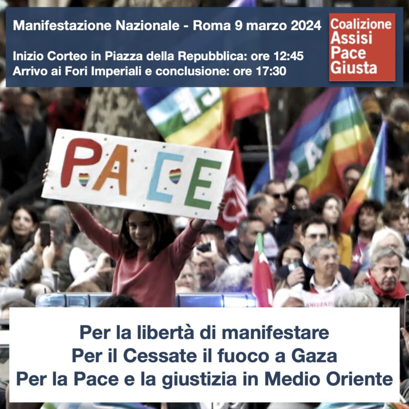 Il corteo della manifestazione si ritroverà alle 12.45 di Sabato 9 marzo 2024 in Piazza della Repubblica a Roma, per poi raggiungere i Fori Imperiali e concludersi per le 17.30; l’iniziativa è promossa da: