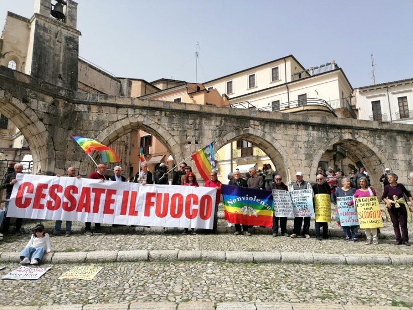 Sulmona è tornata in piazza contro le guerre. Un sit-in si è svolto il 30 marzo, ai piedi della scalinata della centralissima piazza Garibaldi, dove è stato esposto uno striscione con la scritta “Cessate il fuoco“, insieme a cartelli e bandiere della pace.