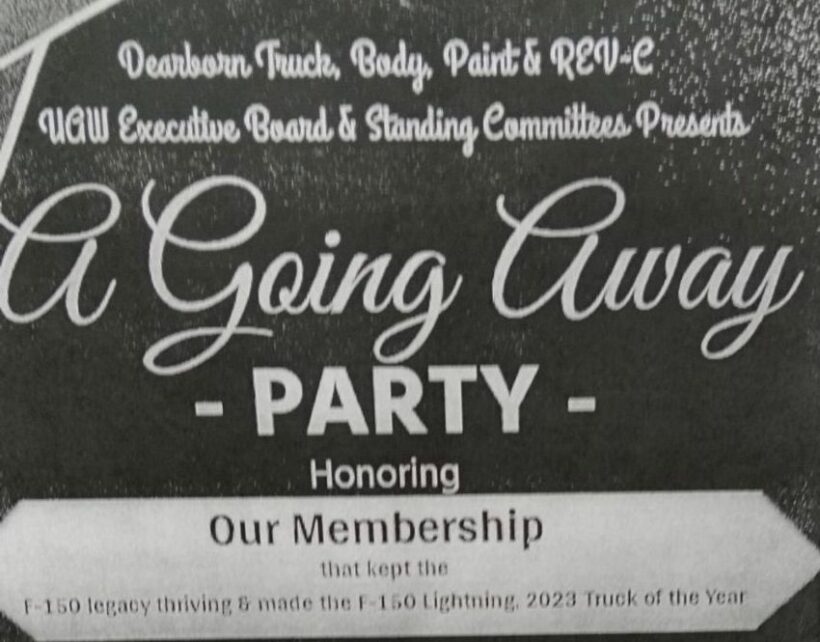 Ciò premesso, il 13 aprile, nell’occasione in cui molti operai lasceranno l’azienda per trasferimenti e dimissioni “volontarie”, la sezione locale del sindacato UAW, la local 600, ha organizzato un “Going Away Party” in cui si vanta l’appartenenza all’azienda e la soddisfazione che il pick-up F-150 Lightning sia stato nominato Truck of the Year nel 2023.