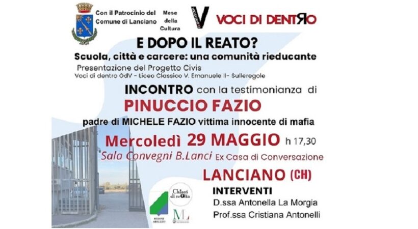 Mercoledì 29 maggio a Lanciano presso la Sala B. Lanci, h 17,30, si terrà l’incontro E dopo il reato? Scuola, città e carcere: una comunità rieducante. Modera l’incontro Antonella La Morgia, di Voci di dentro.