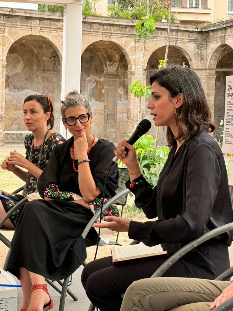 Con l’autrice ha conversato l’attivista Marta Bellingreri insieme ad Amal Hajal, manager di progetti sul tema della protezione e della violenza di genere, che dopo il 7 ottobre non è più potuta rientrare in Palestina e ha dovuto seguire a distanza le vicende delle persone cui era legata, come la morte per cancro del nonno rimasto privo di terapia o l’esodo della sua amica Intifar, che ha dovuto cambiare sette case dopo l’intimazione di evacuazione, con le sue due bambine ferite e prive di cure, e che ora vive nelle tende: le tocca percorrere due chilometri a piedi per andare a raccogliere tre litri d’acqua e altrettanti per tornare.