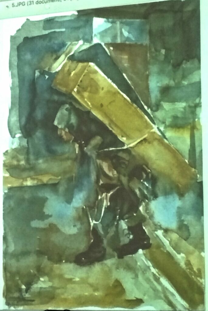 Scorrono le immagini e scorre pure il tempo ma, a differenza di studenti e studentesse, io non ho altre lezioni da seguire, così resto con i pochi superstiti, affascinata dalle opere del nostro relatore e dalle sue parole. Tra le pennellate di colore dei ritratti ad acquerello e la costruzione geometria dello spazio, in cui la connessione tra astratto e figurativo in dissolvenza dipinge la sua poetica di personale memoria, torna il paragone con la poesia che rivela solo alla fine la sua costruzione progressiva aprendosi alla comprensione.