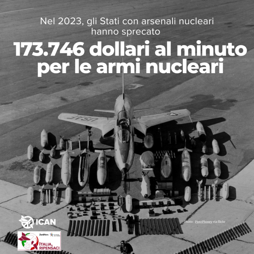 Ecco perché l’International Campaing to Abolish Nuclear Weapons (ICAN) ha indetto una settimana di azione globale dal 16 al 22 settembre 2024: una mobilitazione che si svolgerà proprio quando i Paesi di tutto il mondo si riuniranno per trovare soluzioni alle più grandi sfide globali del nostro tempo. Da oggi fino alla riunione degli Stati, invitiamo le persone di tutto il mondo a dirci per cosa preferirebbero che il denaro fosse speso, e a settembre ci attiveremo insieme con un messaggio chiaro: “Niente soldi per le armi nucleari!”. Le iniziative della settimana di mobilitazione verranno rilanciate nel nostro Paese dalla campagna “Italia, ripensaci” (promossa da Rete Italiana Pace e Disarmo e da Senzatomica) che da anni promuove iniziative affinché la volontà di disarmo nucleare ben radicata nella maggioranza degli italiani venga presa in considerazione dai decisori politici.