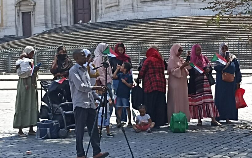 In quella piazza dell’Esquilino mi colpisce il gruppo delle donne sudanesi che nonostante il gran caldo, con i loro abiti che le coprono integralmente, si presentano poco dopo l’inizio, un po’ alla spicciolata con i bambini e un po’ a gruppetti e sono tutte lì insieme, più o meno all’ombra di un grosso albero; una di loro riprende tutto in un video “per Tik Tok” (lo so perché a un certo punto mi si avvicina e mi chiede se anche io faccio le riprese per Tok Tok); i bambini bevono le aranciate nei cartoni e sventolano le bandierine del Sudan. Lo slogan che prevale è “Barra barra janjaweed” che vuol dire “Via via” e lo si alterna con canzoni di lotta sudanesi a cui tutti partecipano con entusiasmo, qualcuno anche danzando.