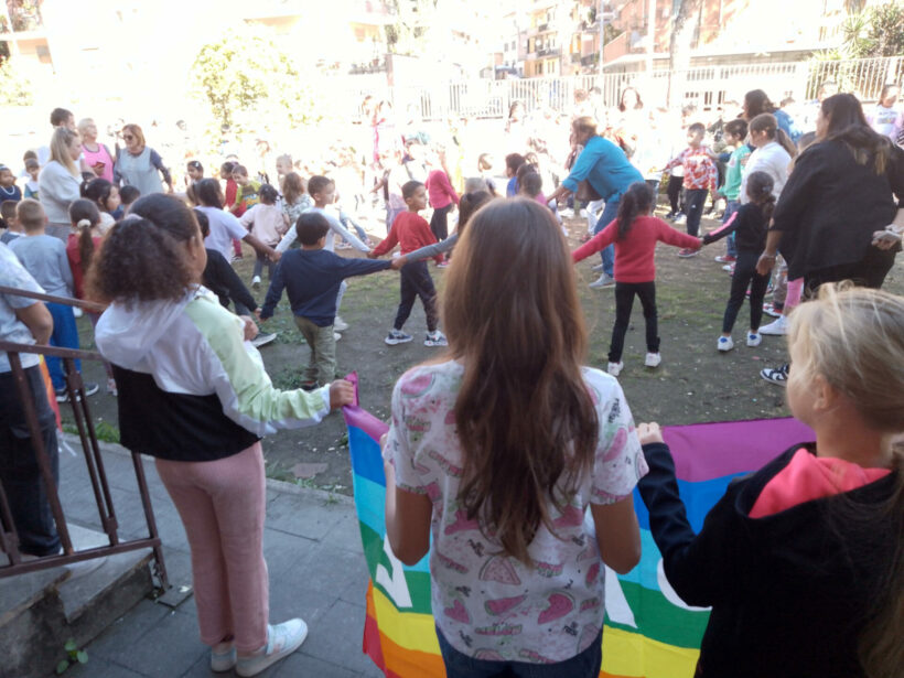 Per scendere nel concreto nella mia scuola, il plesso Arvalia dell’Istituto Comprensivo Antonio Gramsci, dello storico quartiere popolare del Trullo, ora uno dei più multietnici della Capitale, bambine e bambini, ragazzine e ragazzini delle tre sezioni della Scuola dell’Infanzia e le dieci classi della Scuola Primaria hanno cantato insieme la canzone di Ghali “Casa mia, casa tua”, che avevamo già imparato lo scorso anno, e hanno poi formato dei cerchi concentrici partendo dai più piccoli di tre, quattro e cinque anni fino ad arrivare a quelli di dieci anni.