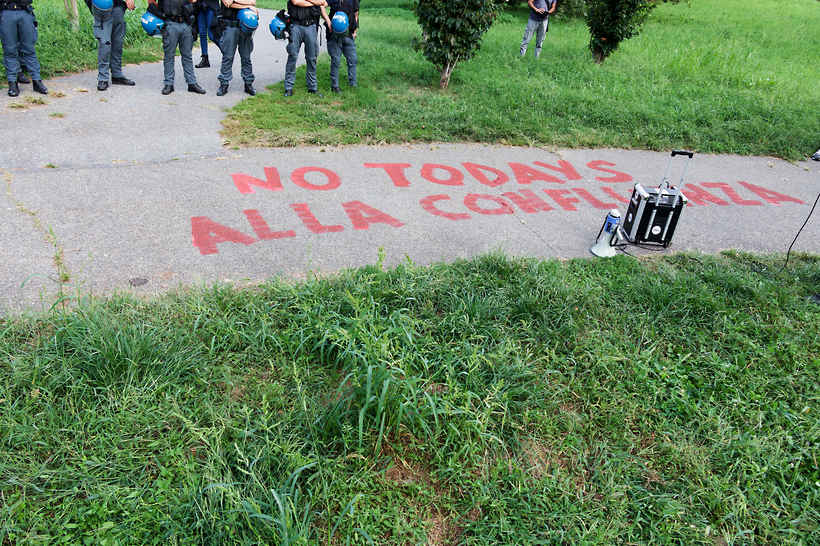 La protesta si è conclusa con l’iscrizione sul vialetto che conduce all’ingresso del festival, protetto da una decina di agenti, della scritta «NO TODAYS ALLA CONFLUENZA» con tempera lavabile rossa.