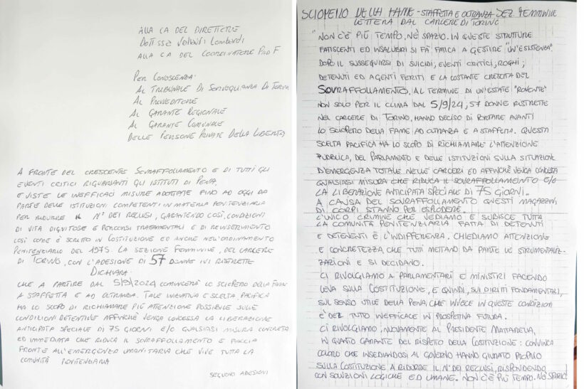 Al termine di un’estate “rovente” non solo per il clima, dal 5/9/24, 57 donne ristrette nel carcere di Torino, hanno deciso di portare avanti lo sciopero della fame ad oltranza e a staffetta.