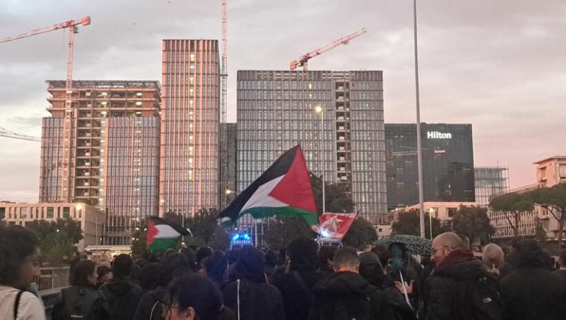 Dopo la manifestazione nazionale tenutasi a Roma lo scorso 5 ottobre, in concomitanza con le giornate di azione lanciate a livello globale alla vigilia del 7 ottobre e caratterizzate, soprattutto in Italia, da un clima di crescente militarizzazione e repressione di carattere governativo, nel tardo pomeriggio di oggi 8 ottobre numerosi cittadini, attivisti per i diritti umani e membri di movimenti studenteschi si sono riuniti nel quartiere romano dell’EUR diretti al Centro Congressi “La Nuvola” al grido “Sabotiamo il genocidio. Disertiamo la guerra e chi ne guadagna” contro l’industria degli armamenti e la speculazione sul genocidio in corso in Palestina. Sempre a Roma si sta tenendo, infatti, la giornata inaugurale dell’evento annuale di riferimento a livello europeo nel campo della sicurezza informatica “Cybertech Europe 2024” promosso dalla piattaforma globale del settore della cybersecurity “Cybertech” che riunisce esponenti di rilievo dell’industria degli armamenti e influenti rappresentanti della società israeliana.