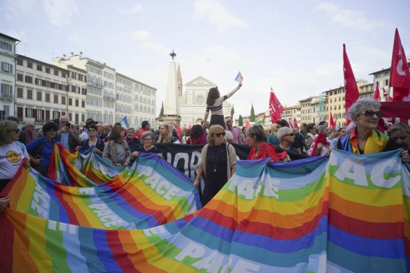 Mao Valpiana, il presidente del Movimento Nonviolento italiano, ha ricordato i sette i colori della bandiera della pace che oggi stanno accendendo sette piazze e sette città italiane; forse grazie ai grandi numeri di persone presenti – qui a Firenze dicono circa 30.000 – i media, la Rai non potranno non darne notizia. Sono sempre più silenti verso questo vero movimento politico che ha piena coscienza che una terza via, la via della nonviolenza è possibile ed oggi è troppo numeroso per essere trascurato nelle notizie.