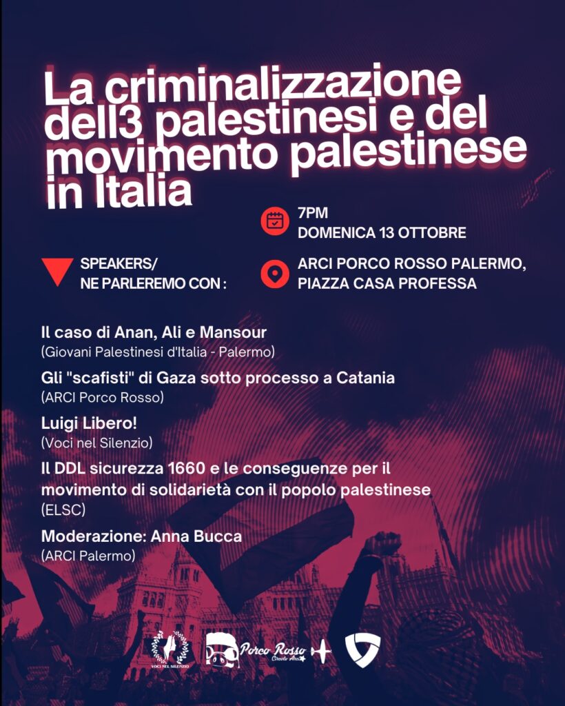 Si è svolto domenica sera al circolo Arci Porco Rosso di Palermo un interessante incontro dal titolo “La criminalizzazione dell3 palestinesi e del movimento palestinese in Italia”.