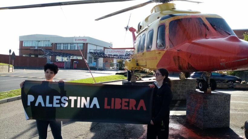 28.10.2024 – Vergiate (Varese). Questa mattina alle ore 9.45 tre attiviste aderenti alla campagna “Palestina Libera”, hanno lanciato tempera rossa lavabile contro un elicottero della Leonardo s.pa. –Divisione Elicotteri, esposto davanti l’ingresso dello stabilimento.