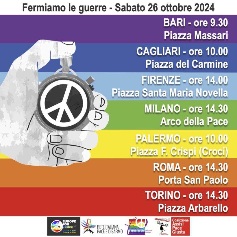 Presentata oggi in una conferenza stampa online la Giornata di mobilitazione nazionale “Fermiamo le guerre, il tempo della Pace è ora”. Sabato 26 ottobre 7 piazze italiane (come i colori di un arcobaleno pacifista) grideranno a gran voce le proposte della società civile che chiede percorsi di pace, disarmo, giustizia sociale e climatica.