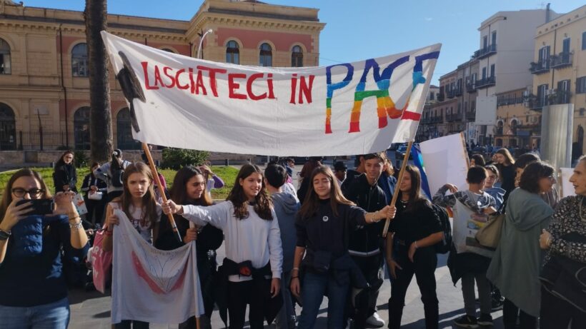 È colorato e canoro il corteo che la mattina del 25 novembre, nella giornata per l’eliminazione della violenza sulla donna, ha attraversato le vie intorno alla scuola Nicolò Turrisi, da cui sono partiti i bambini e le bambine, insieme ai loro compagni della scuola media, per partecipare anche loro alla Terza Marcia Mondiale della Pace e della Nonviolenza che in questi giorni attraversa l’Italia.