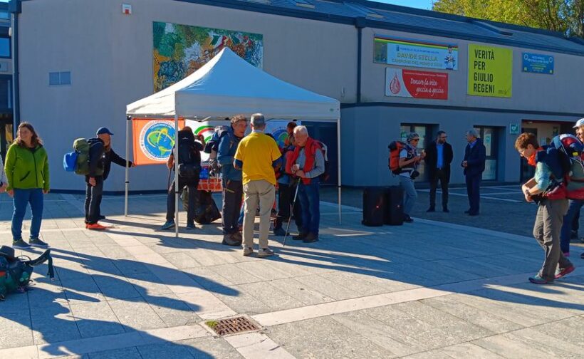 Dopo un caloroso momento conviviale illuminato da un tiepido sole autunnale, i presenti hanno formato un corteo, che si è diretto verso il cimitero per raccogliersi sulla tomba di Giulio Regeni, ricordato per il suo Cammino verso gli altri, per il suo grande rispetto verso i più vulnerabili, costruttore anche lui di Ponti di Pace sulle sponde del Mediterraneo.