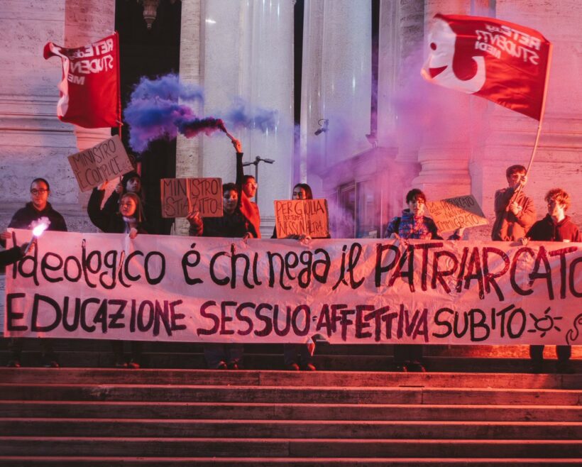 Ieri sera, in risposta alle dichiarazioni sulla violenza di genere del Ministro Valditara, gli studenti della Rete degli Studenti Medi erano sotto al Ministero dell’Istruzione in presidio.