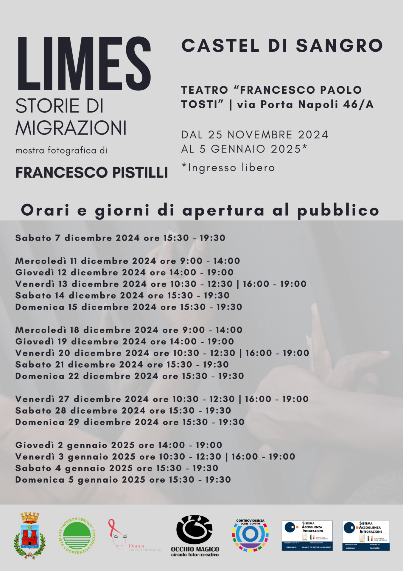 A Castel di Sangro, invece, fino a domenica 5 gennaio 2025 è aperta la mostra “Limes. Storie di Migrazioni” presso il Teatro “Francesco Paolo Tosti” in via Porta Napoli n. 46/A; la mostra è stata inaugurata lo scorso 25 novembre, Giornata internazionale contro l’eliminazione della violenza sulle donne” ed è organizzata in collaborazione con il Circolo Fotoricreativo “L’Occhio Magico”, il Centro Antiviolenza “Donna” di Castel di Sangro e vede il Patrocinio del Comune di Castel di Sangro.