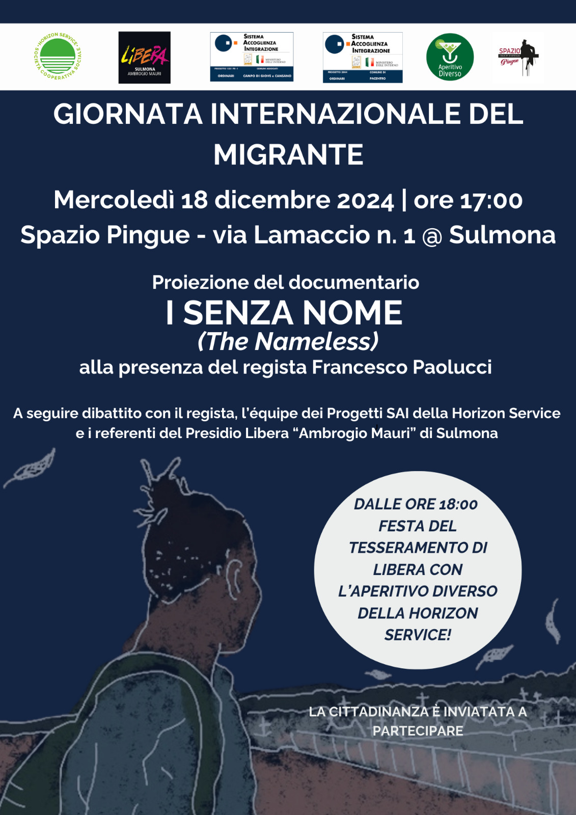 Mercoledì 18 dicembre alle ore 17:00 presso Spazio Pingue in via Lamaccio n. 1 a Sulmona è prevista la proiezione del documentario “I Senza Nome” alla presenza del regista Francesco Paolucci, con cui vi sarà un dibattito aperto dopo la visione collettiva del docufilm. L’iniziativa è organizzata in collaborazione con il Presidio Libera “Ambrogio Mauri” di Sulmona.
