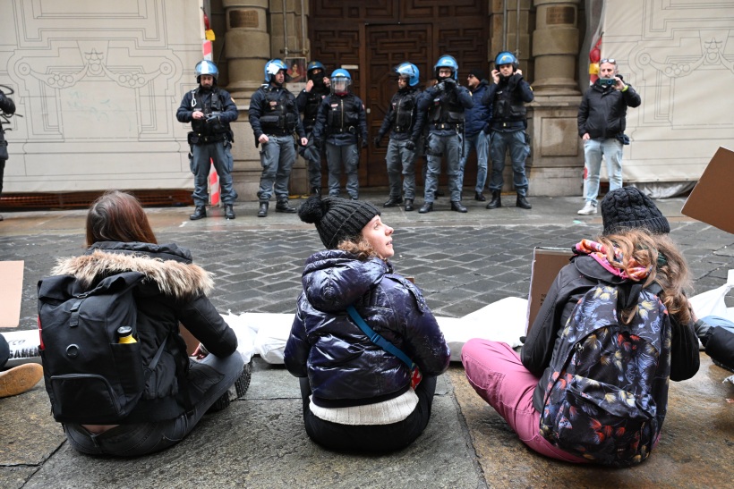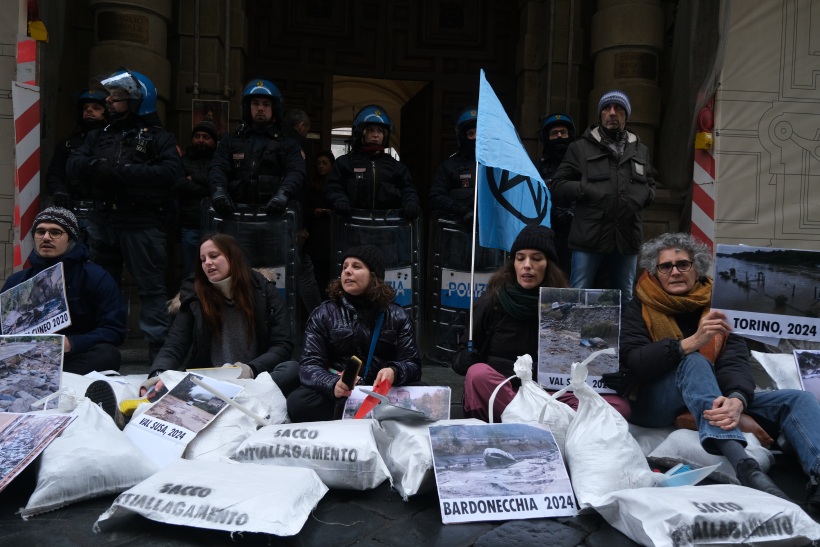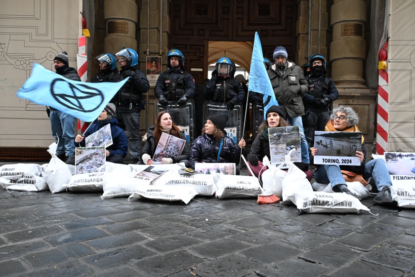 Questa mattina, poco prima dell’inizio della discussione sull’aggiornamento del Piano regionale sulla Qualità dell’Aria in Piemonte, Extinction Rebellion ha scaricato sacchi anti allagamento all’ingresso di Palazzo Lascaris, a Torino, sede del consiglio regionale. All’esterno dell’edificio esposto anche un grande striscione con scritto “La Regione fa acqua da tutte le parti” e alcune immagini di recenti disastri alluvionali, per denunciare la mancanza di politiche regionali adeguate nel far fronte all’aumentare degli eventi estremi sul territorio. “Siamo qui per ricordare alla Regione Piemonte che la crisi climatica sta già provocando danni e causando vittime in tutta la regione” dichiara Matilde. “Non è più accettabile che vengano discussi e approvati piani regionali timidi, basati su normative europee ormai vecchie, e del tutto incapaci di rispondere con l’urgenza che questa crisi richiede. Piani regionali che fanno acqua da tutte le parti” commenta ancora, indicando i sacchi.