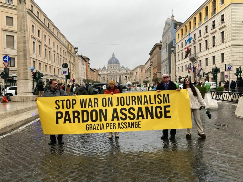 Domenica 5 gennaio a mezzogiorno un gruppo di attivisti per Assange ha invaso Piazza San Pietro, portando uno striscione e dei cartelli, per domandare al Papa di chiedere a Joe Biden, durante la sua visita in Vaticano venerdì prossimo, la grazia presidenziale per Julian Assange. Tra gli attivisti spiccava Vincenzo Vita, già Senatore della Repubblica e garante dell’Articolo21 (video).