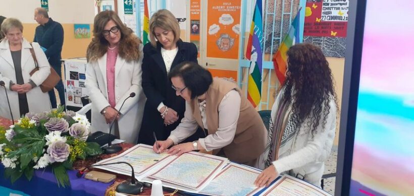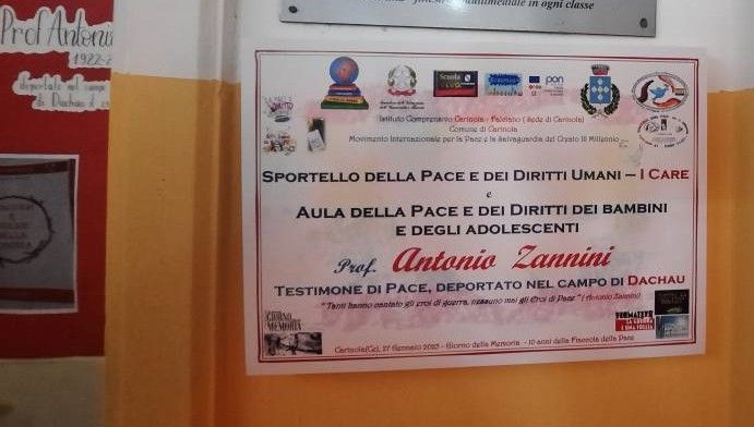 Caserta/ Carinola, 27 gennaio, Giorno della Memoria, all’IC Carinola inaugurazione con taglio del nastro tricolore unito a quello della Pace, della prima “Aula della Pace e dei Diritti dei bambini e degli adolescenti” ( la prima in provincia di Caserta) intitolata al Testimone di Pace Antonio Zannini deportato nel campo di concentramento di Dachau e dell’ inaugurazione dello “Sportello della Pace e dei Diritti umani – I Care”. Il Comune di Carinola diventa “Città per la Pace”, il Sindaco Di Biasio sigla il “Patto di impegno per la Pace.