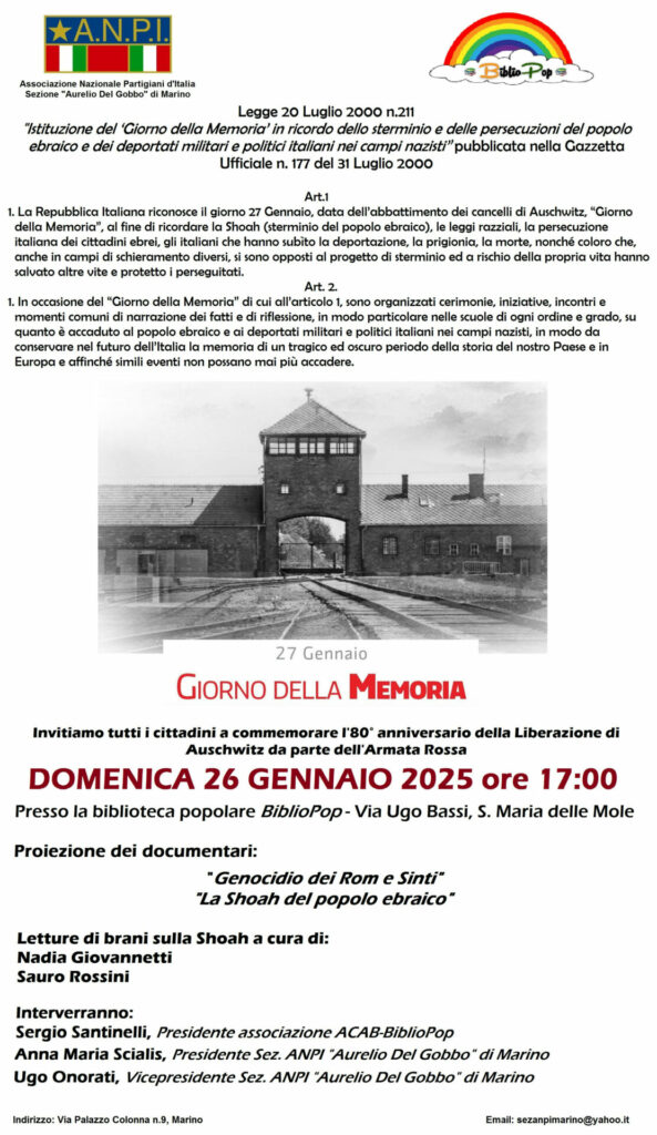 Bibliopop e Anpi sezione “Aurelio Del Gobbo” organizzano confronto su Giorno della Memoria domenica 26 alle 17.00. Il 27 Gennaio ricorre il Giorno della Memoria in ricordo “dello sterminio e delle persecuzioni del popolo ebraico e dei deportati e politici italiani nei campi nazisti” istituito dal Parlamento italiano con la legge n.211 del 20-7-2000.