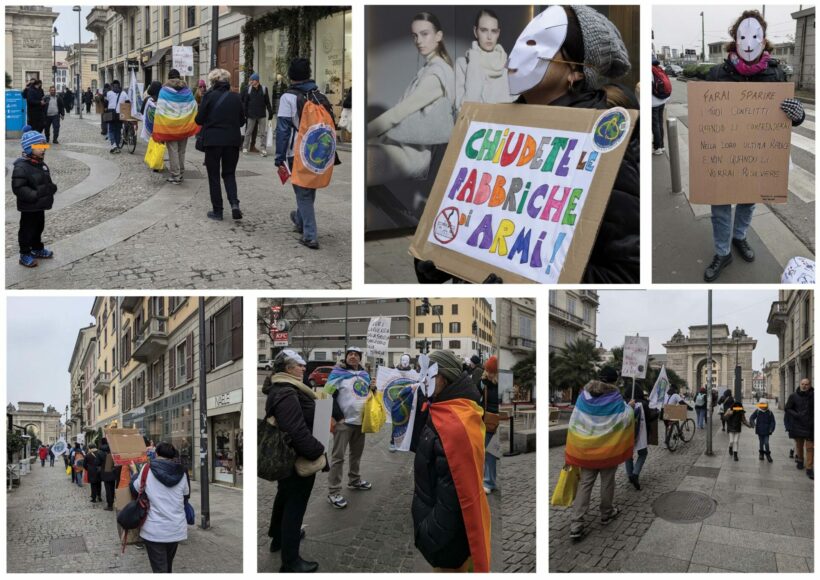Camminiamo in fila tra i numerosi passanti di Corso Como. Per quanto non siamo in molti, circa una ventina, ci notano, alcuni sostano a guardare il nostro passaggio. Sentiamo qualcuno commentare: “Perché si coprono la faccia?” Spieghiamo che indossare la maschera ci permette simbolicamente di spersonalizzarci, ci rende plurali, siamo “le persone “, siamo insieme in Marcia oggi e continueremo a marciare! Così uniti, vogliamo veicolare nel tempo a venire i valori, le speranze, le “richieste” che si è voluto per la terza volta portare all’attenzione del mondo, in questo momento nell’abisso di guerre e violenze inaudite che coinvolge il pianeta tutto, con tutta la sua ricchezza di esseri senzienti, di vita naturale.