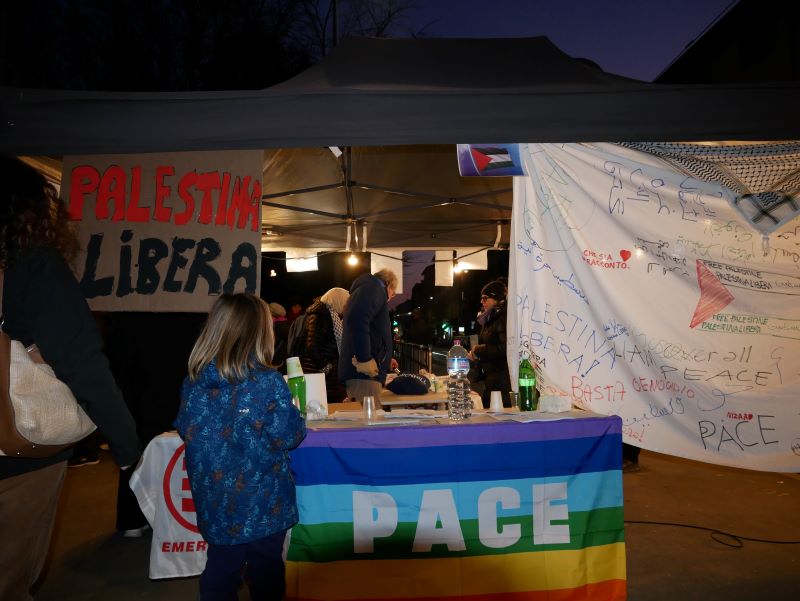 Sono lì in tanti, intorno ad un gazebo, per dire: “Fermiamo il massacro in Palestina!”, “Fermatevi!”.
