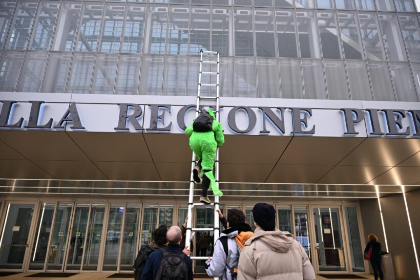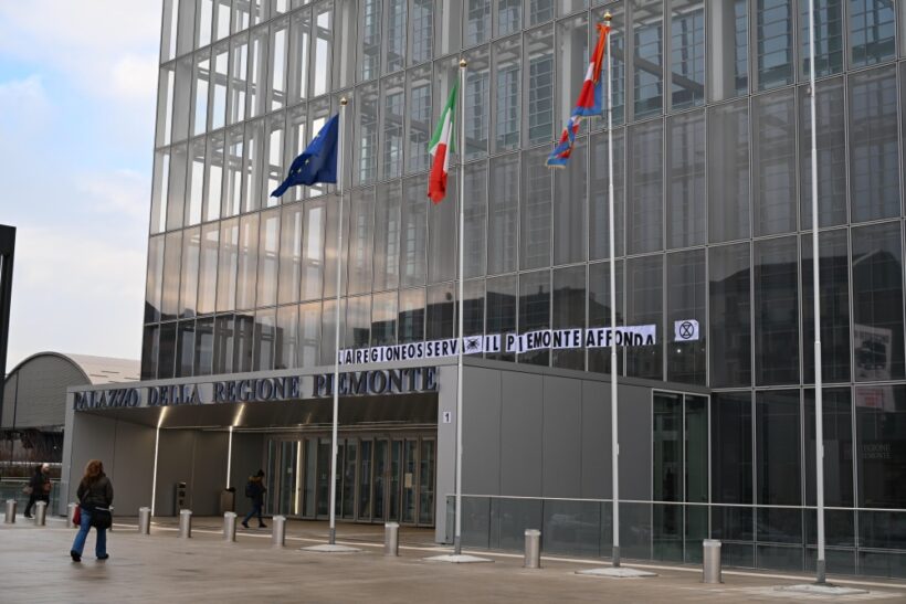 A poche settimane dal blocco della Leonardo spa a Brescia, Extinction Rebellion torna in azione a Torino: un gruppo di persone si è arrampicato questa mattina sopra la tettoia di ingresso del Grattacielo della Regione Piemonte e ha incollato una maxi scritta che recita “La Regione osserva, il Piemonte affonda”, dopo aver appeso uno striscione con scritto “Regione Piemonte: un altro anno di fallimenti”.