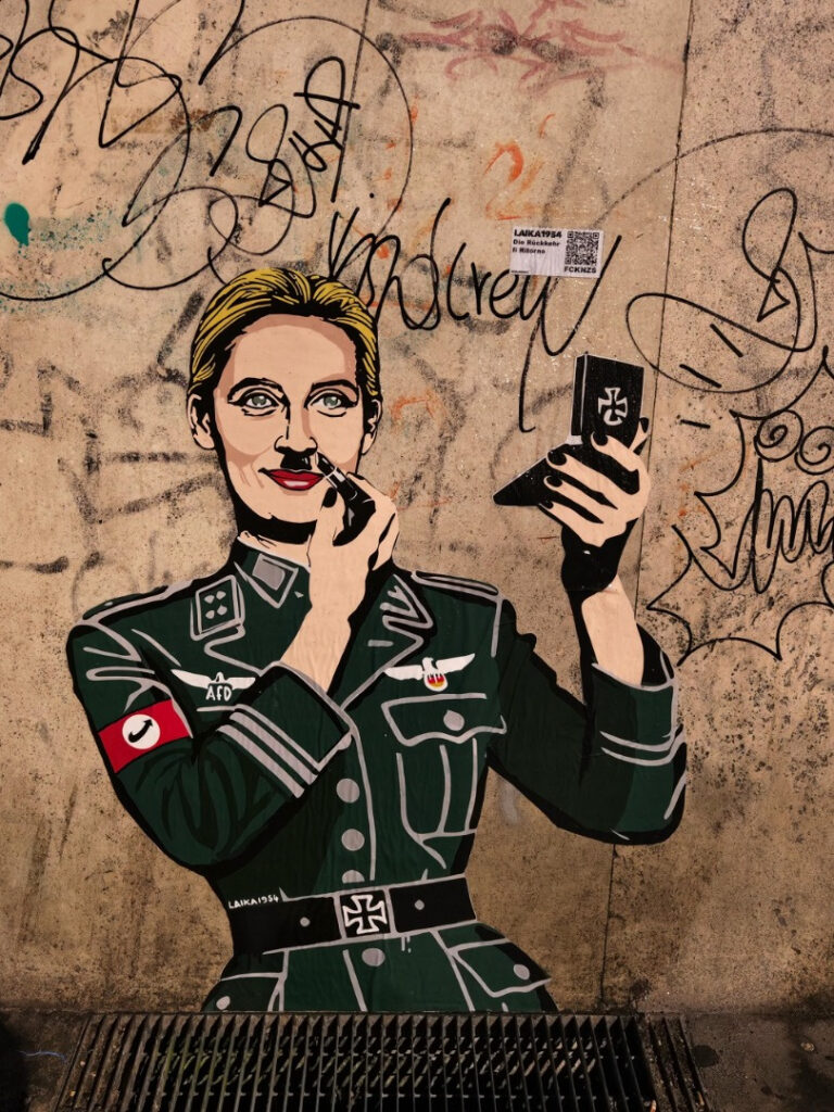 Il poster raffigura Alice Weidel, leader del partito di estrema destra AfD, in uniforme nazista mentre si disegna in viso con un rossetto nero i baffi di Hitler.