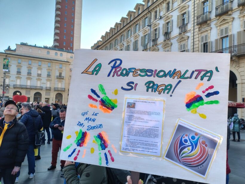 Cantando “Volare” ed improvvisando un enorme girotondo per tutta piazza Castello, oltre 500 tra educatori ed Operatori SocioSanitari (OSS), utenti dei servizi a favore di persone con disabilità (intellettiva e/o fisica) ed i loro famigliari, si sono riuniti sabato pomeriggio 15 febbraio, con l’obiettivo di accendere un riflettore sulla politica di settore del Comune di Torino e sulle conseguenze che essa può portare.