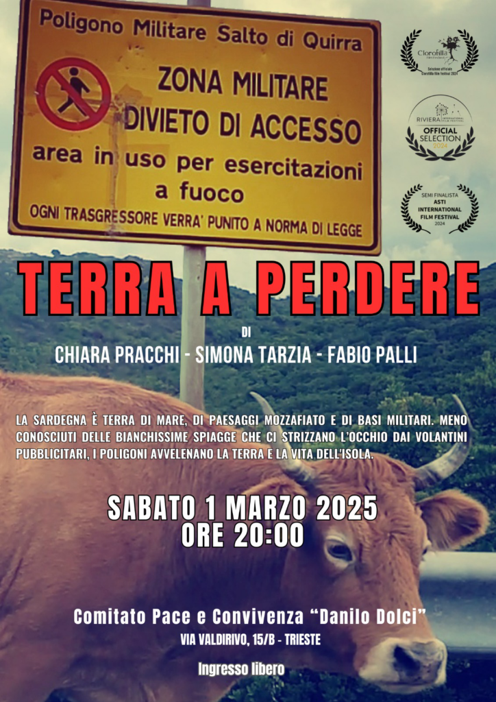 Sabato 1 marzo 2025 alle ore 20:00 presso il Comitato pace convivenza e solidarietà “Danilo Dolci” in via Valdirivo 15/a a Trieste, la giornalisti Simona Tarzia e l’operatore video Fabio Palli presenteranno il documentario “Terra a perdere”, sui disastri sanitari ed ecologici procurati agli abitanti e all’ambiente della Sardegna dalle attività militari, nelle basi e nei poligoni di tiro che occupano larga parte del territorio isolano.