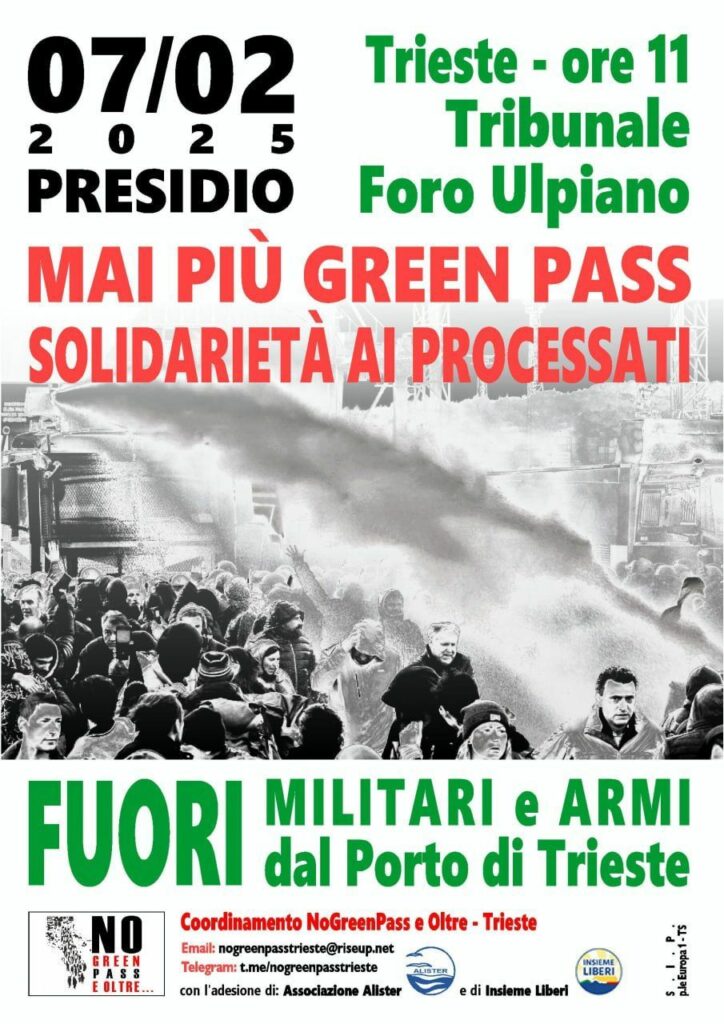 Dopo due settimane dall’ultima udienza, il 7 febbraio si riapre il processo per lo sgombero del porto, il 18 ottobre 2021. Alle 11.00 saremo nuovamente fuori dal tribunale di Trieste, in Foro Ulpiano, perché, ancora una volta, non vogliamo lasciare soli i processati, capri espiatori per punire una mobilitazione di migliaia di persone contro l’infame tessera verde.