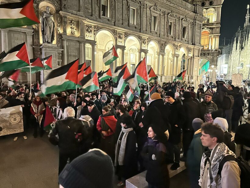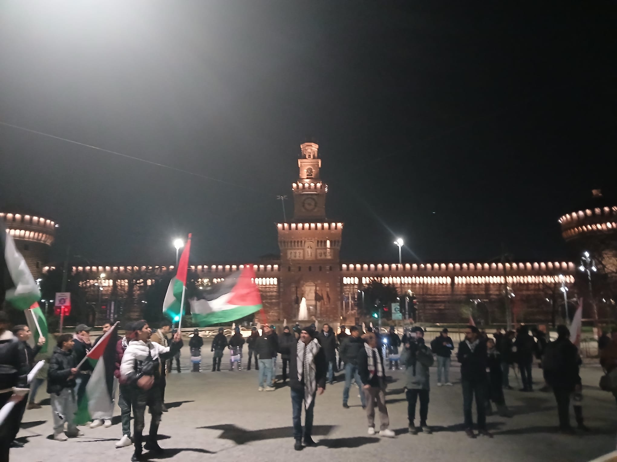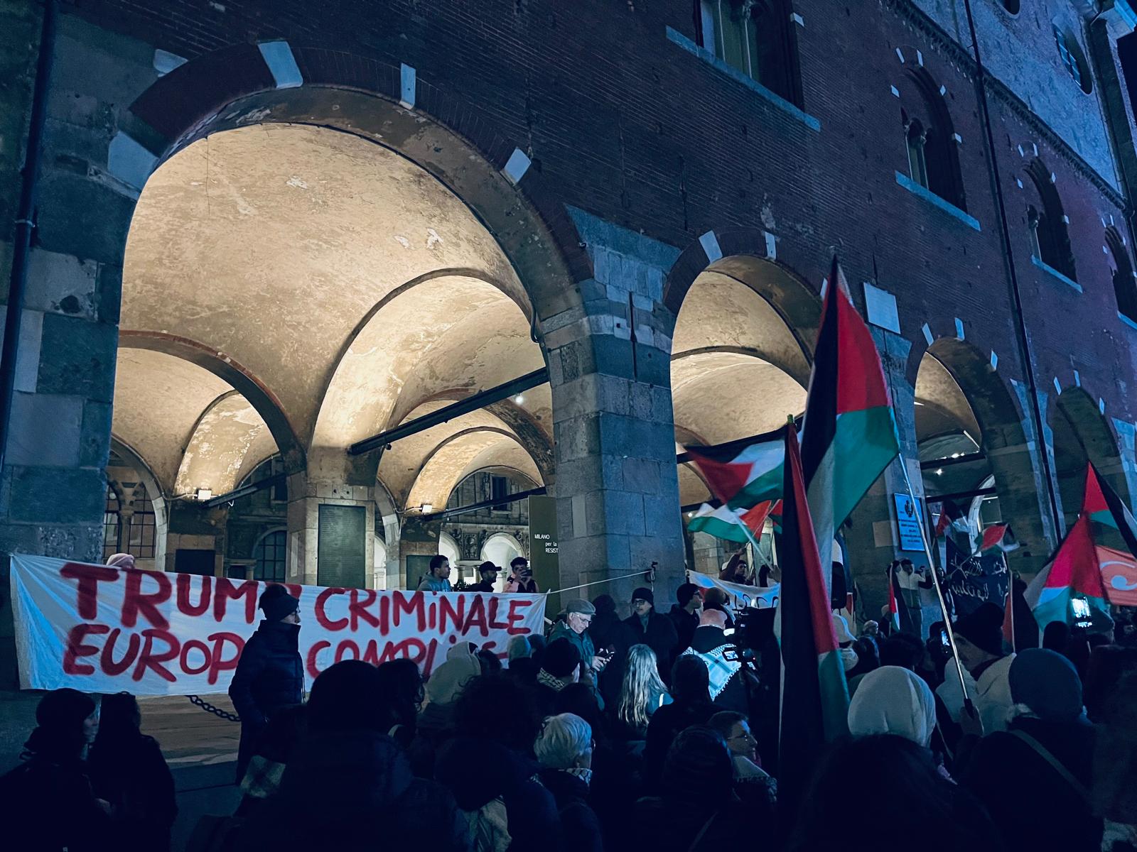 Bombardamenti a Gaza la notte, presidio subito, la sera stessa. La Loggia dei Mercanti viene trasformata in un palco “naturale”, con una scritta fantastica alle spalle: “Milano per la resistenza”. Dove sarebbero oggi i partigiani e le partigiane?