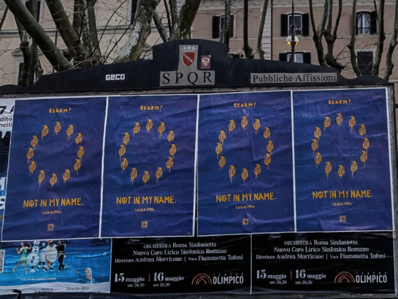 Con questa azione, Laika lancia un appello alle piazze di sabato 15 marzo (Piazza del Popolo e Barberini): “La pace non si costruisce con più eserciti, ma con più giustizia sociale. Il ReArm Europe consegnerà l’Unione Europea direttamente nelle mani dei nazionalisti di estrema destra”.